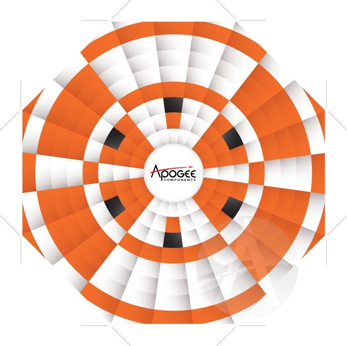 Tough rip-stop nylon cloth parachute with a highly visible printed pattern that adds some color to the rocket’s flight. It feels like silk and can be packed tighter to fit smaller diameter tubes. Octagon shape, the size is 36″ diameter as measured from flat edge to flat edge.