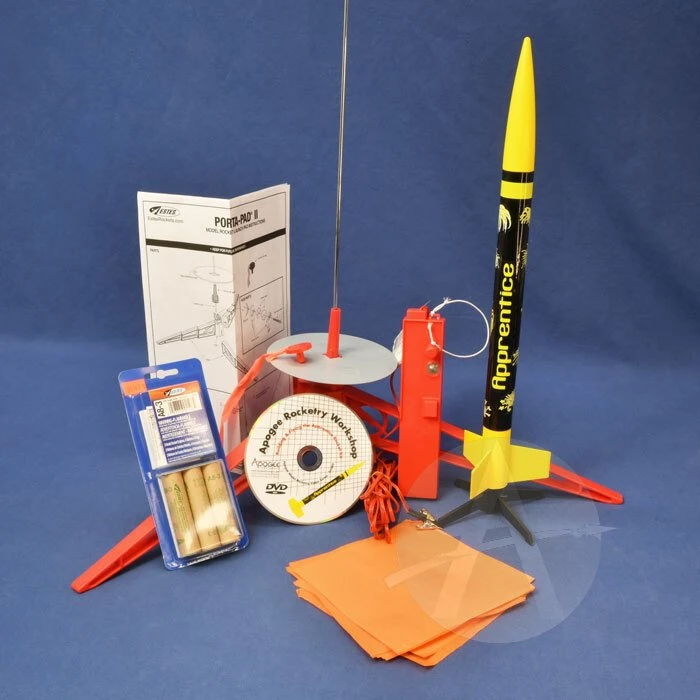 The Apogee Apprentice was designed to be a “first kit” for someone that has never participated in rocketry before. Includes Apprentice rocket kit, launch pad, three A8-3 rocket motors, igniters, 20 sheets of wadding, and launch controller. Also included is a DVD that will guide you through the construction and launching of this rocket kit.