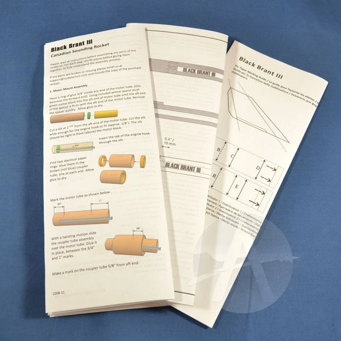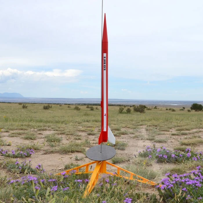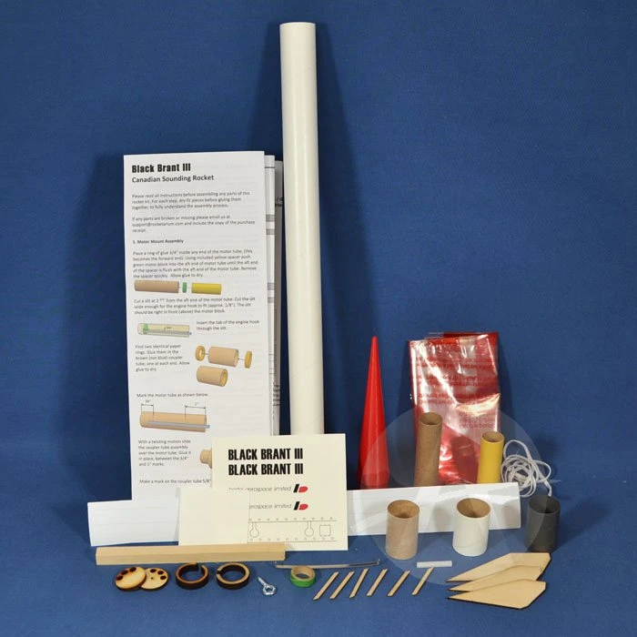 The real Black Brant III is a Canadian sounding rocket designed to launch small payloads of up to 39 pounds to around 72 miles high into the atmosphere. This single-stage scale kit is about 21.8 inches tall and features a 3D printed nose cone, laser-cut basswood fins, water-slide self-adhesive decals, and quick-change engine hook.