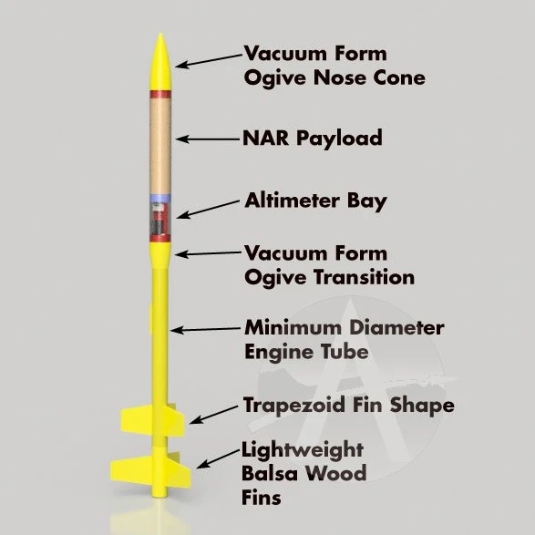 The Midge was specifically designed for the NAR’s “Payload Altitude” contest event, but it can be flown just for fun too. It is a two-stage rocket designed to carry both a small altimeter and the 28-gram NAR Standard Payload weight.