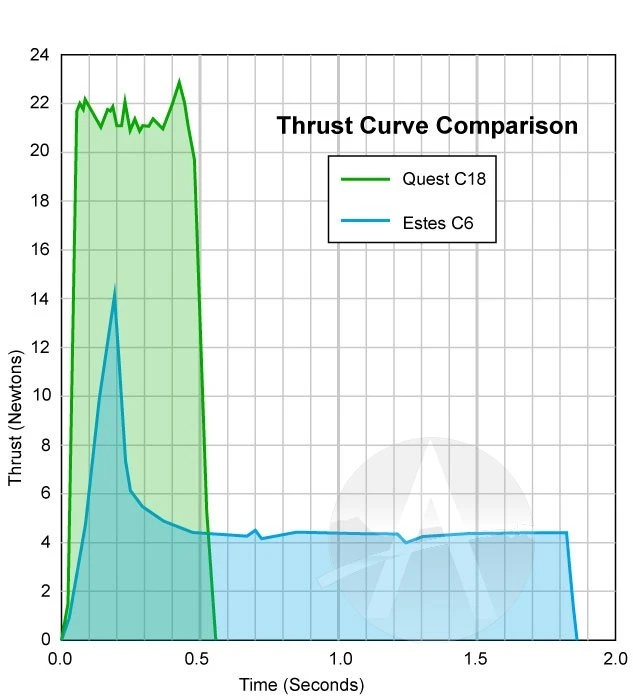 The Quest C18-6 is a great all-around motor for your typical rockets. It is particularly suited for heavier or larger diameter rockets. It features composite propellant, which has twice the energy as a black powder motor. Same size and diameter as an Estes motor, so it fits all your favorite rockets. But this is for single-stage rockets only, as it cannot be staged.