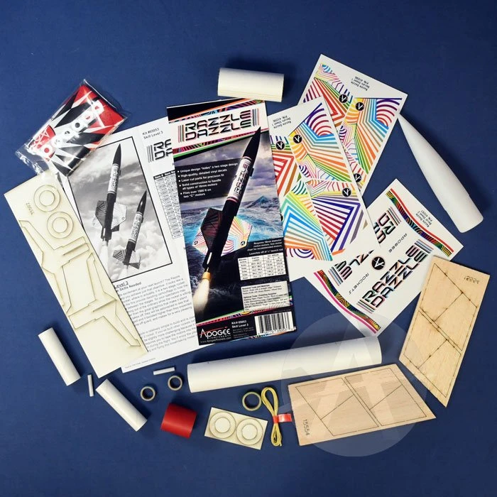 The Razzle-Dazzle is a fun two-stage rocket that tries to hide its fin separation line, so it looks like a single-stage rocket. Spectators will be dazzled by the surprise separation. Easy to build, and comes with loads of decals.